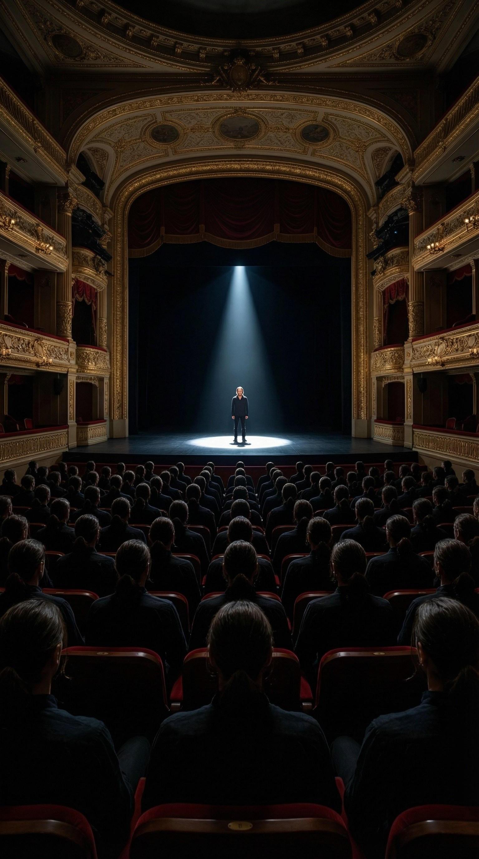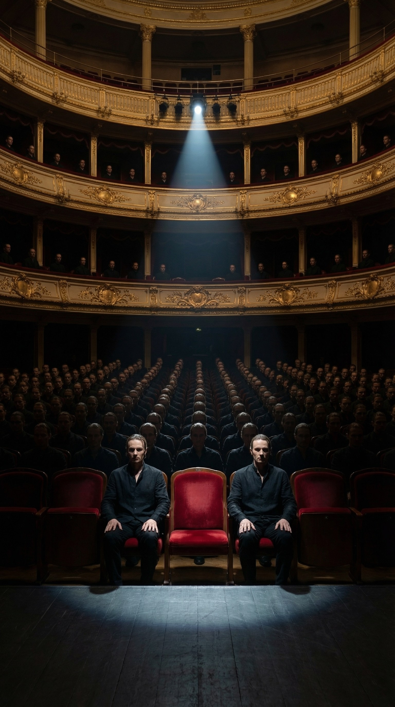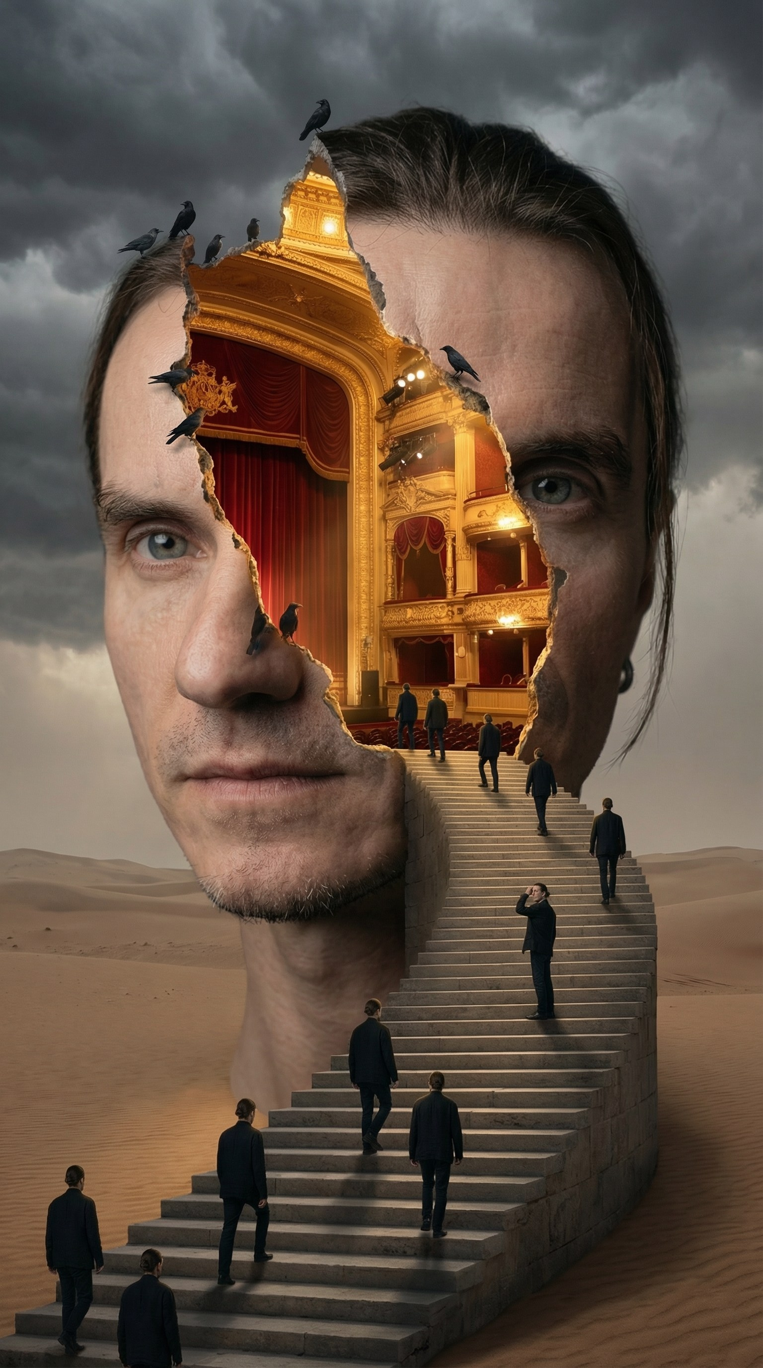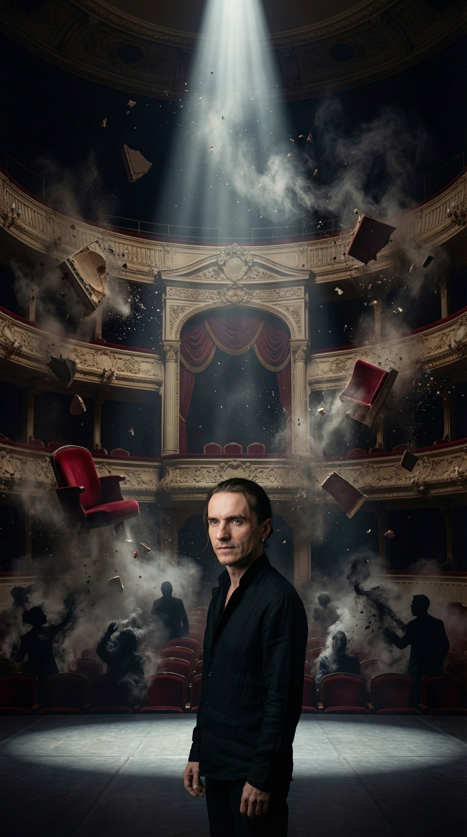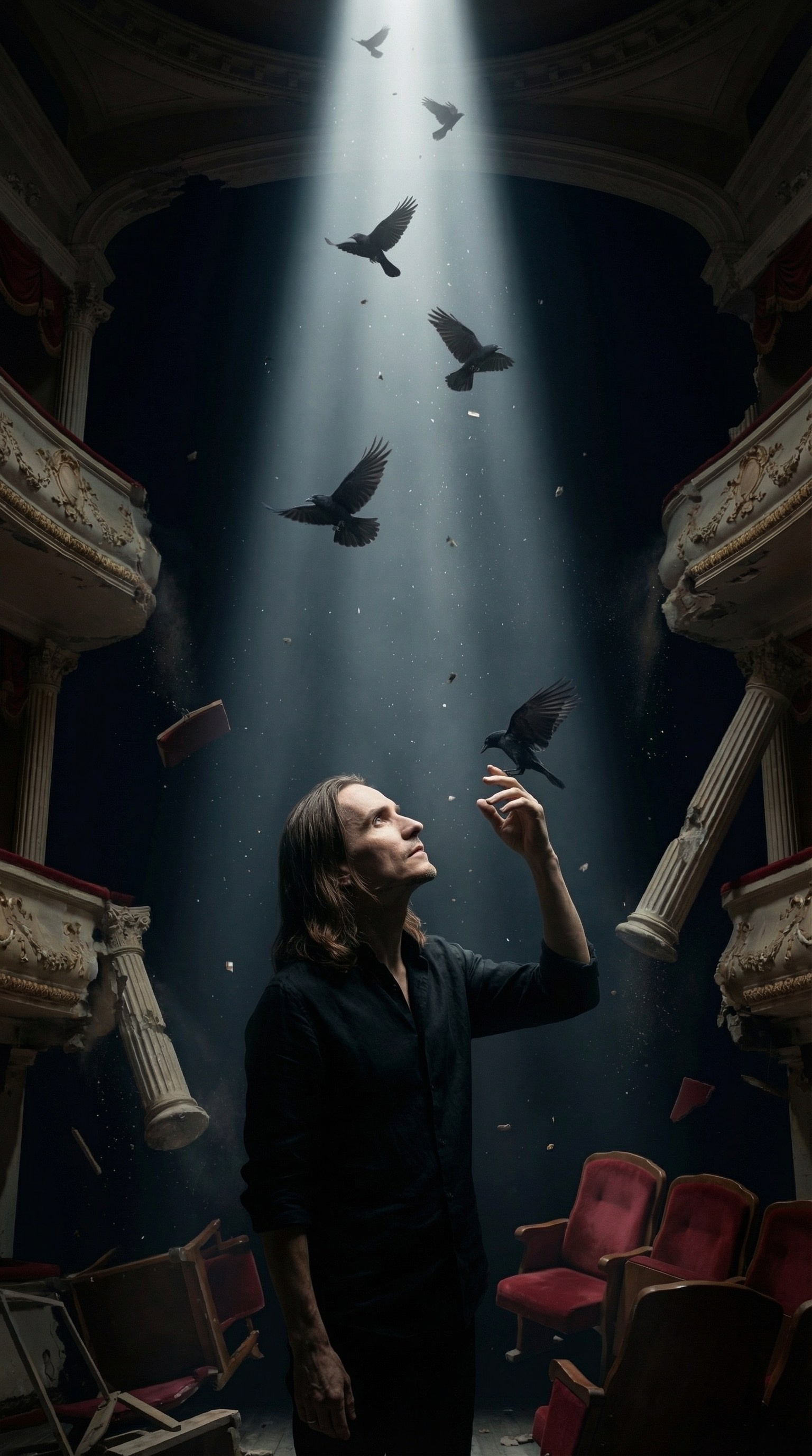 Серия создана как стилизация и художественная переработка образа внутреннего пространства человека. Театр становится метафорой сознания: зрительный зал мыслей, сцена внимания и момент, когда привычные декорации начинают разрушаться. В процессе визуальной трансформации пространство постепенно освобождается от внутреннего шума. Финальный образ — жест руки и птица в луче света — символизирует момент, когда мысли перестают удерживать внимание и пространство становится тихим и открытым.